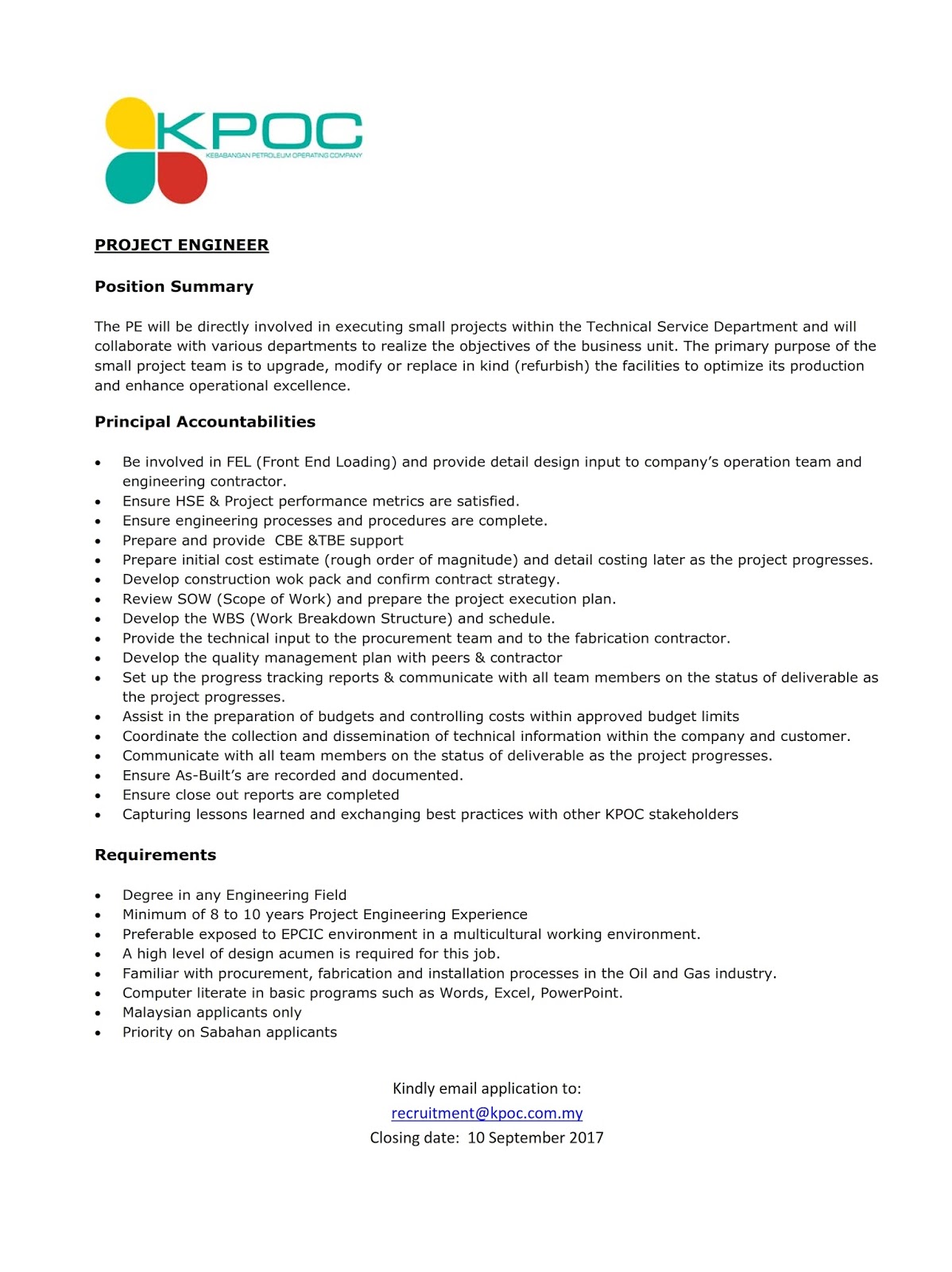 Oil Gas Vacancies Kebabangan Petroleum Operating Company Sdn Bhd Kpoc Kota Kinabalu Offshore Kuala Lumpur