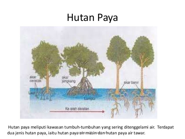 Tumbuh tumbuh yang terdapat di hutan pantai ialah pokok ru pokok kelapa pokok renek mengkuang laut. Pokok yang tumbuh biasanya tinggi. Selain hutan hujan tropika terdapat juga paya di negara kita tahukah anda bahawa terdapat dua jenis hutan paya di malaysia iaitu hutan paya air masin dan hutan paya air tawar apakah perbezaan antara kedua dua jenis hutan paya tersebut teliti jadual di bawah untuk mengetahui lebih lanjut tentang kedua dua jenis hutan paya tersebut. Hutan paya air masin.