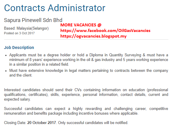 Oil Gas Vacancies Contracts Administrator Sapura Pinewell Malaysia